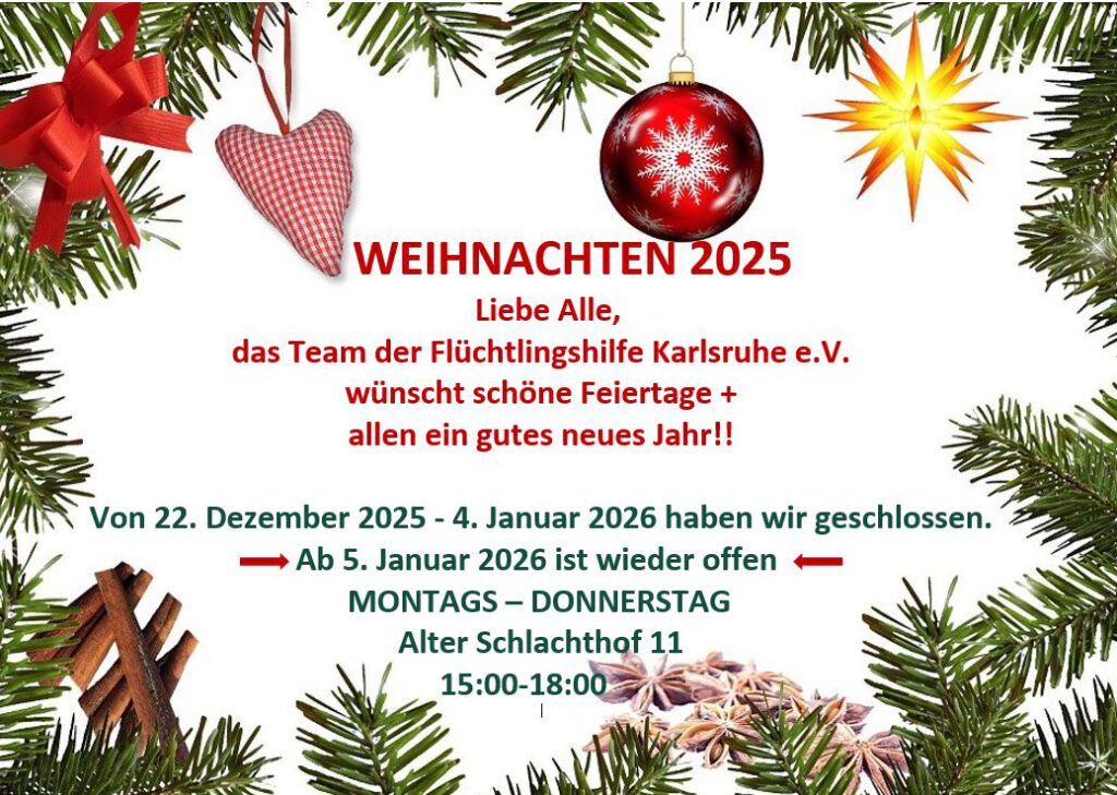 Ein viel beschäftigtes Jahr neigt sich dem Ende: wir bedanken uns sehr herzlich bei allen Ehrenamtlichen und Besucher*innen für die tollen Begegnungen in diesem Jahr und für die gemeinsamen Erlebnisse. Danke auch an alle, die unsere Arbeit unterstützt haben – sei es durch Geld- oder Sachspenden! Wir machen über die Feiertage eine kurze Pause und starten mit viel Tatendrang am 5. Januar 2026 wieder. SCHÖNE UND FRIEDVOLLE FEIERTAGE!